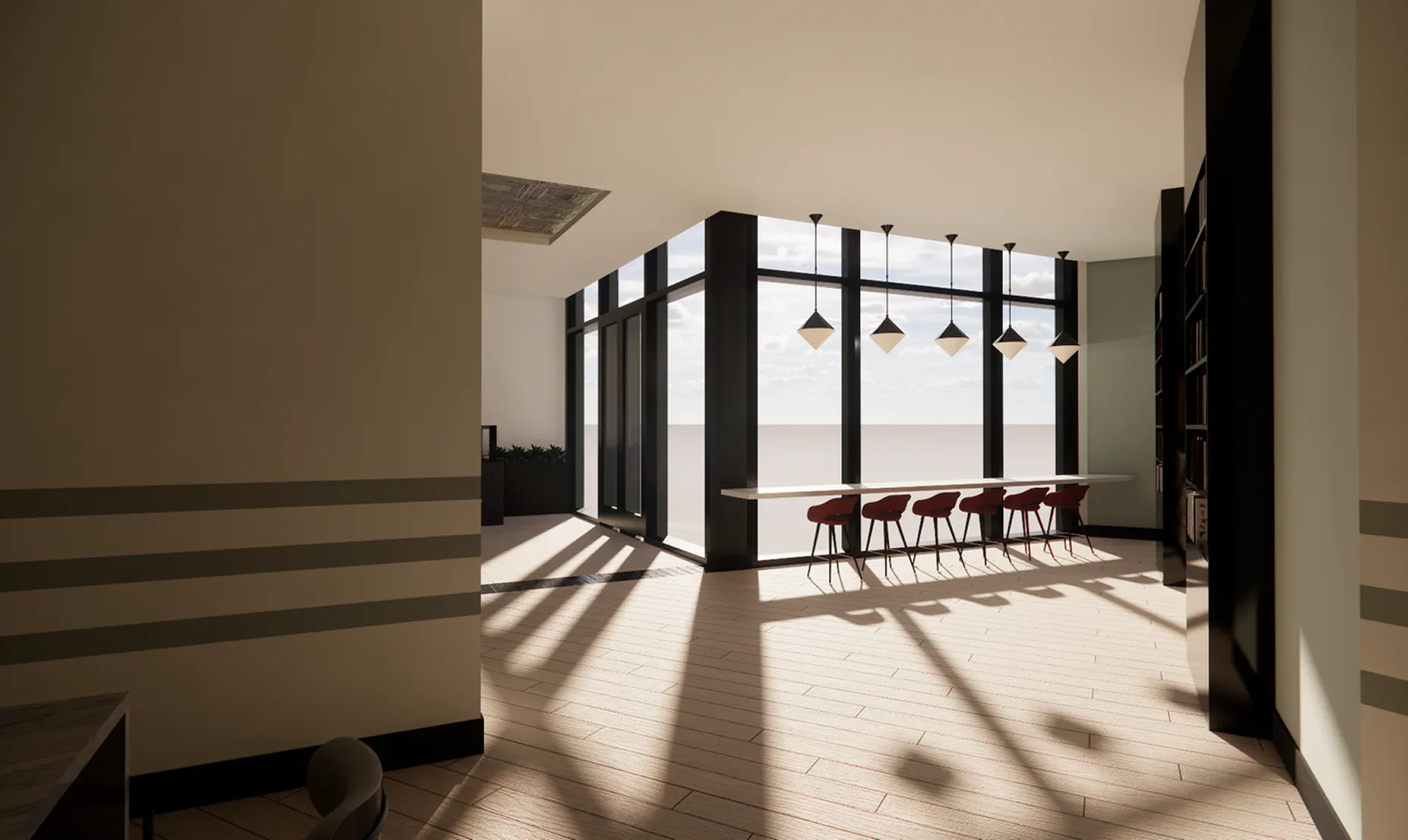 Leasing/coffee lounge, pool lounge, coworking, and fitness.